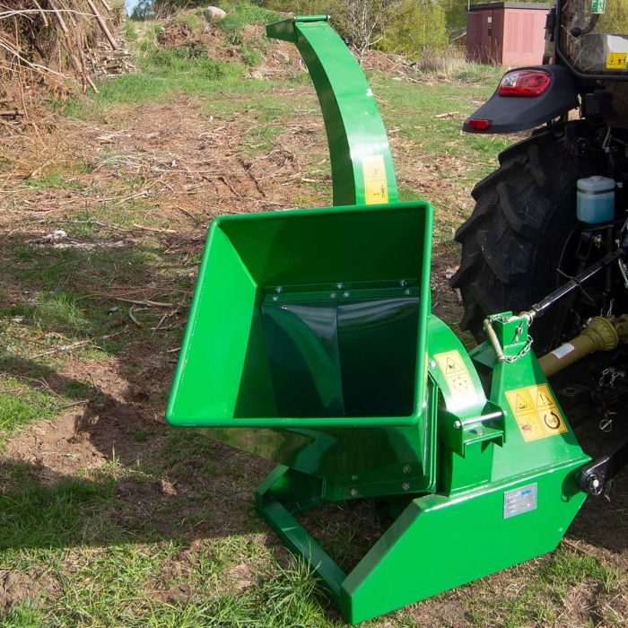 Sichere und problemlose manuelle Zuführung dank des tiefen Zuführtrichters; häckselt kleine Zweige, Äste und Buschwerk für Kompost und als Abdeckmaterial sowie kleineres Holz für Hackschnitzelheizungen. Drehbarer Auswurfturm und einstellbarer Auswurfwinkel für eine gleichmäßige Verteilung oder die Befüllung von Anhängern.
