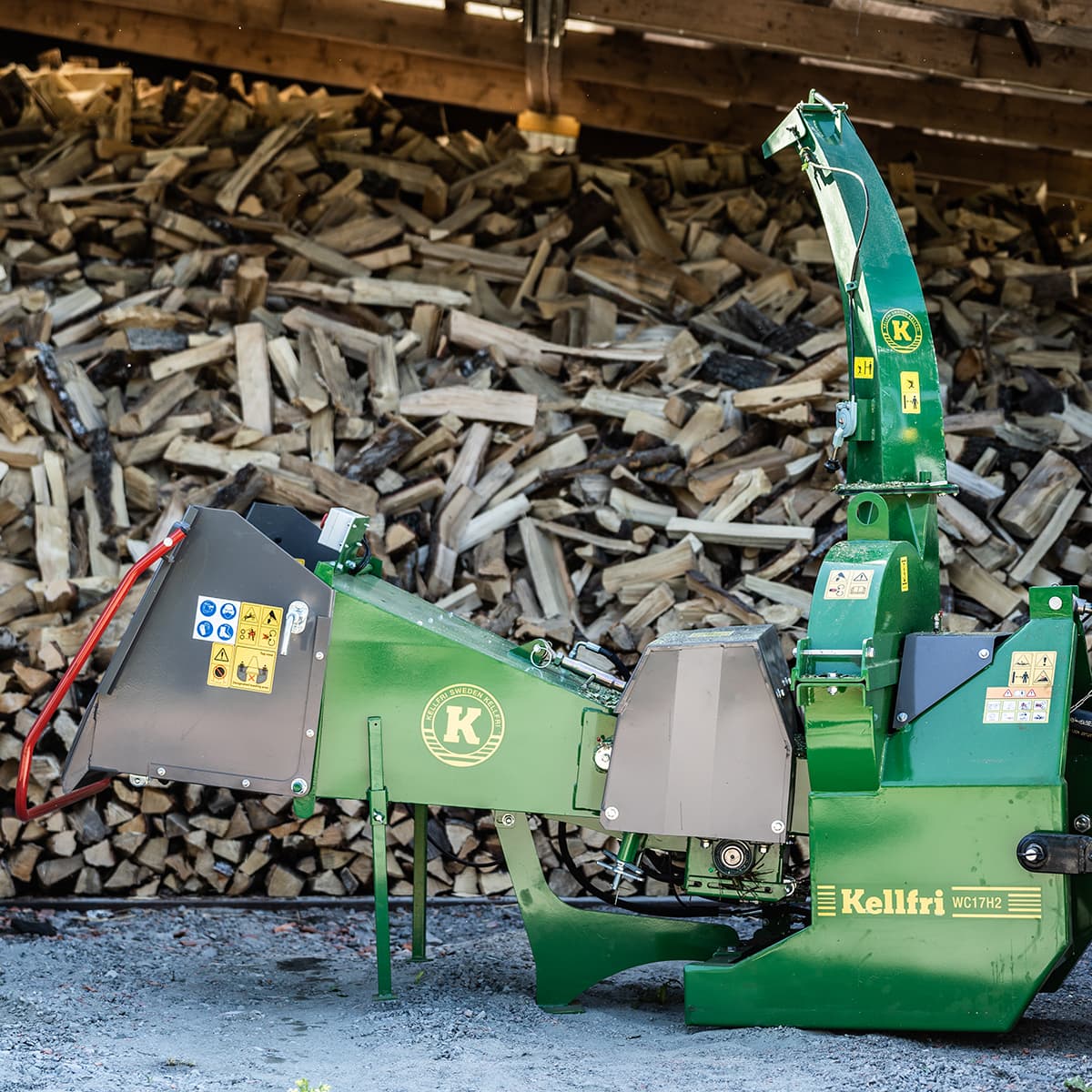Kellfri Häcksler WC17H für Stammdurchmesser von bis zu 17,5 cm, mit schwerer Häckselscheibe, hydraulischen Vorschubwalzen sowie Pumpe und Tank.