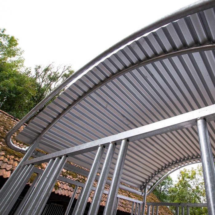 Das Dach ist höhenverstellbar, um das Futter optimal vor Niederschlägen zu schützen. Außerdem ist das Dach standardmäßig umlaufend mit einem Schutzbügel ausgestattet, um maximale Sicherheit für die Tiere zu gewährleisten.